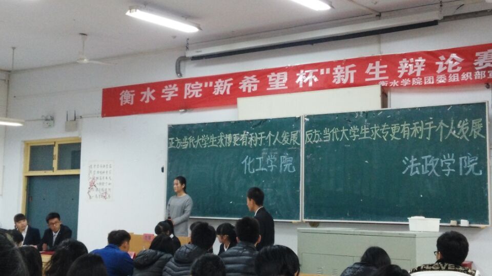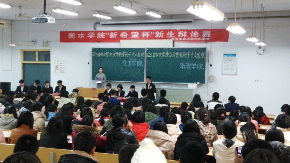 辩论是智慧与力度的展现,辩论是儒雅与思想的融合。2015年11月8日由衡水学院学生会主办、各学院学生会承办的衡水学院“新希望杯”新生辩论赛在2教501隆重举行。此次比赛特邀各学院学生会主席担任评委。 此次比赛由法政学院对战化工学院,双方辩手就“当代大学生求博还是求专哪一个更有利于个人发展”这一辩题展开了激烈的角逐。 首先,双方辩友进行自我介绍来展现他们的风采,接下来,主持人依次介绍了本次辩论赛的评委,然后宣读了比赛规则,比赛正式开始,正方一辩以简练、严谨的开场立论陈词阐明自己的观点,迅速进入比赛状态,反方也不甘示弱,旁征博引,以出色的口才、有力的论证进行激烈的攻辩。第一个环节结束后进行下一个环节,双方互相提问,面对正方的提问,反方表现的沉着冷静,对正方的提问回答的有条有理。到了最精彩的自由辩论环节,双方辩手互替发言,互不相让,立足自己的观点,针对对方的漏洞进行反驳。总结陈词阶段,双方四辩重申自己方的观点并以简洁深刻的语言总结陈词。辩论赛上唇枪舌战,双方辩手妙语连珠,赢得观众的阵阵掌声。辩论赛结束后,稍作放松,进入抽奖环节。抽取了三位幸运观众。此时评委们也在紧张的合算分数。最后,经过激烈的角逐,来自法政学院的沈小月、张蕊、王静书、刘泽晶四位优秀辩手战胜化工学院代表队赢得了比赛。 本次辩论赛活跃了校园文化氛围,丰富了大学生的课余生活,增强了大学生明辨是非能力、逻辑思维能力和语言表达能力,提高了大学生的辩论水平。