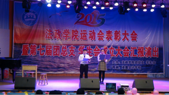 “法政学院2015年运动会表彰大会暨第七届团总支学生会成立大会汇报演出”于2015年12月1日晚七点在多功能音乐厅拉开帷幕。法政学院党总支副书记、副院长刘占卿老师,学工办主任张艳青老师,辅导员王戴香老师出席了本次大会。15级同学和全体学生会干部参加了本次大会。