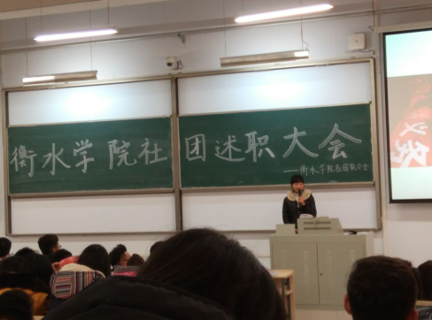 12月17日下午两点我系学生会社团部以及正道国学诵读社、法律服务社、争鸣演讲社和安全生产志愿者协会在16教101参加了学校举办的”2014-2015学年衡水学院社团述职大会”。